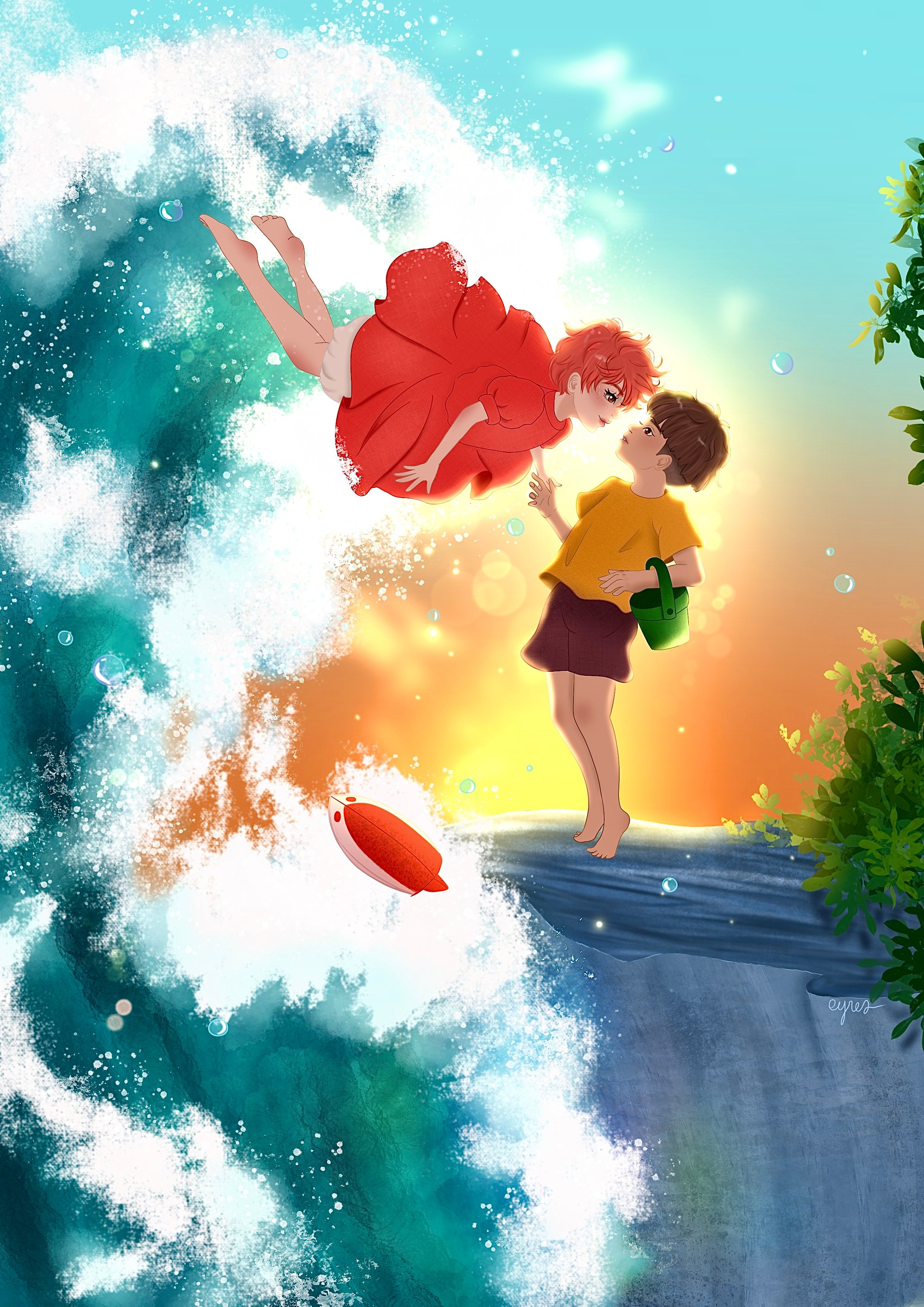 Illustration inspirée de "Ponyo sur la falaise" , représentant Ponyo et Sosuke 🫧